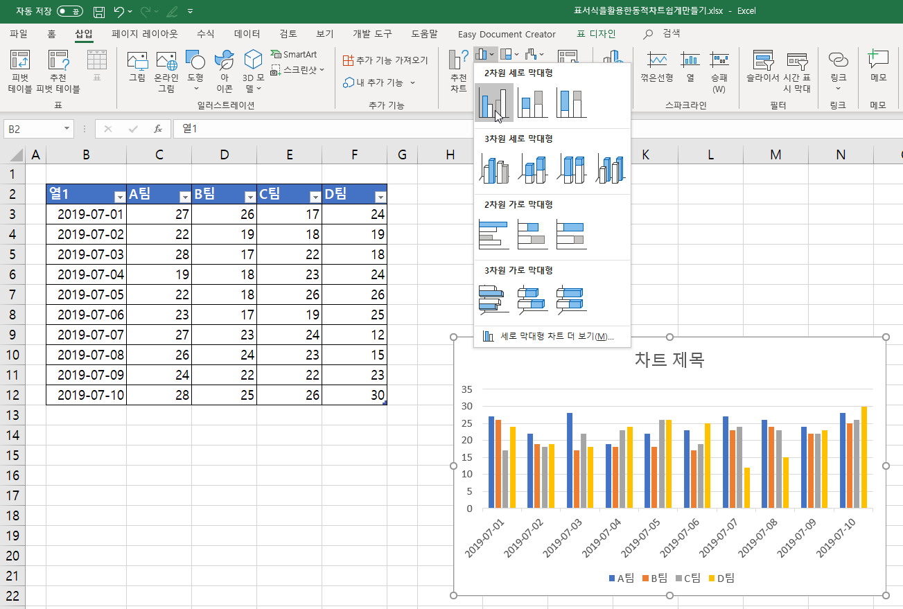 3. 서식이 적용된 표 범위를 다시 선택하고 [삽입] 탭 → [차트] 그룹 → [2차원 세로 막대형]을 선택합니다.