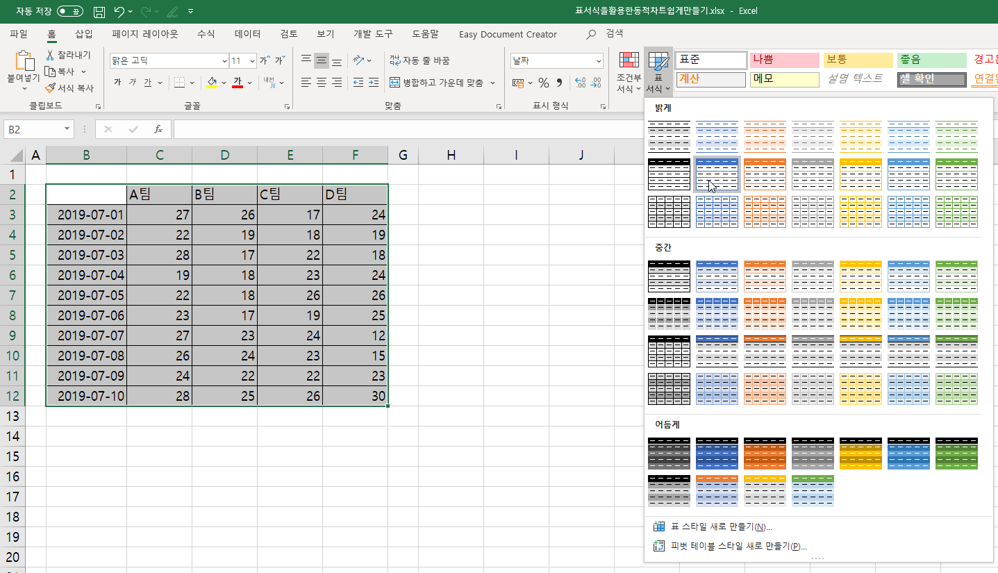 1. 표 범위를 선택하고 [홈] 탭 → [스타일] 그룹 → [표 서식]을 선택합니다.