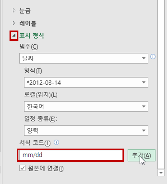 7. 서식 코드 입력창에 mm/dd라고 수정하고 [추가] 버튼을 클릭합니다.