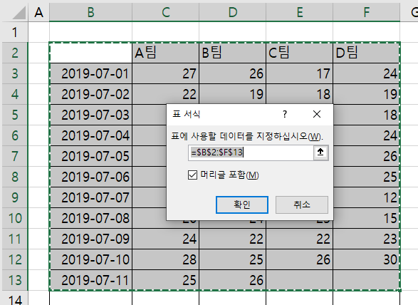 2. [표 서식] 대화상자가 실행되고 선택한 범위가 표 서식 데이터로 지정되면 [확인] 버튼을 클릭합니다.