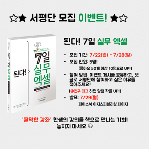 | 된다! 7일 실무 엑셀 서평 이벤트 (0) | 2020.05.11 |
