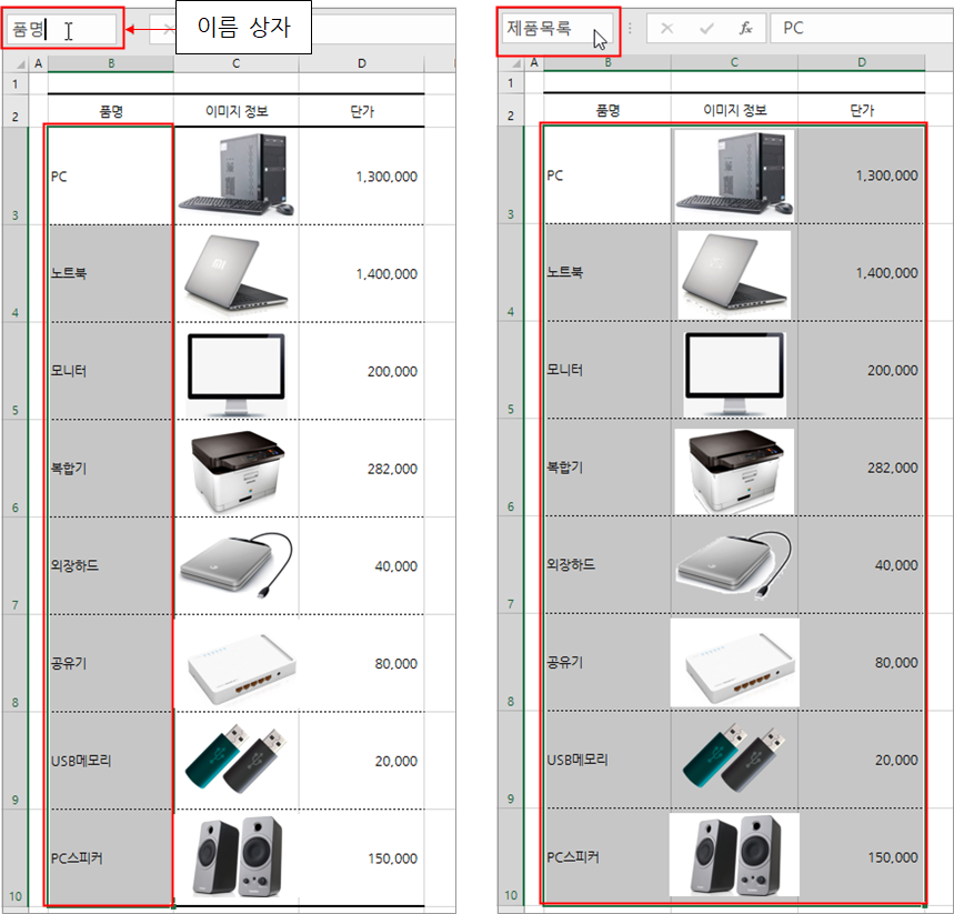 1. 품명 범위 [B3:B10]를 선택하고 이름 상자에 품명이라고 입력하고 <Enter>를 눌러 이름을 정의합니다.