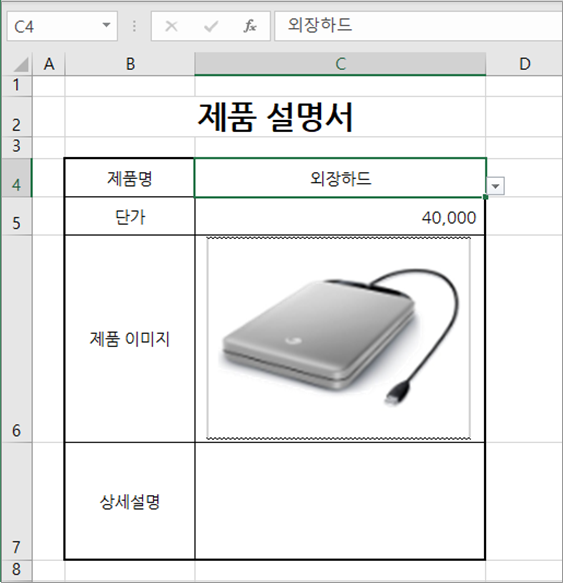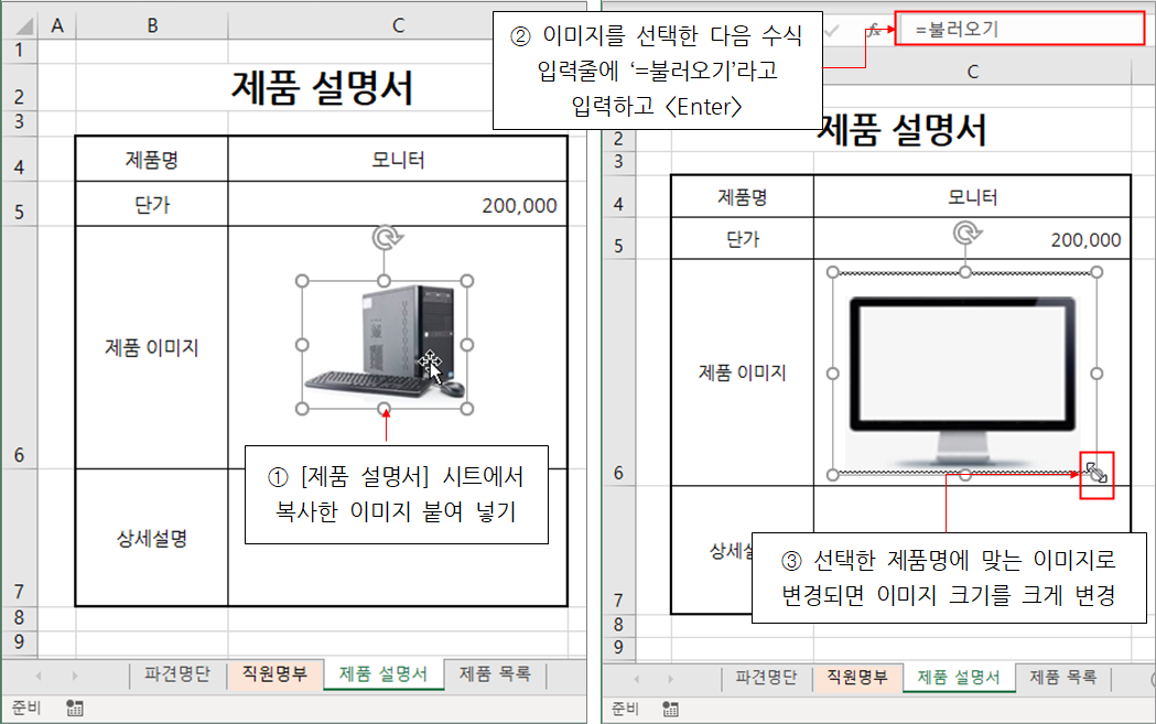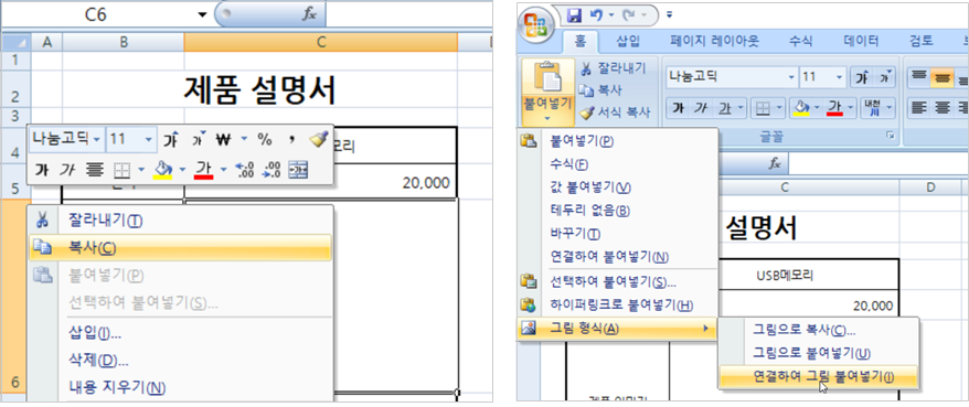 1. [제품 목록] 시트에서 이미지 하나를 복사한 다음 [제품 설명서] 시트 [C6] 셀에 붙여 넣기 합니다.