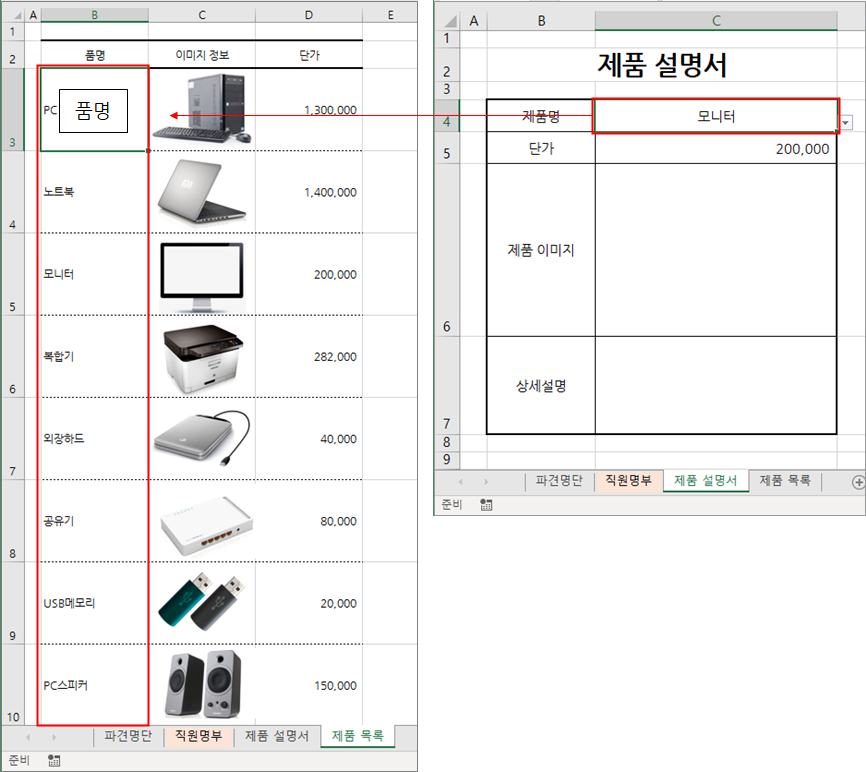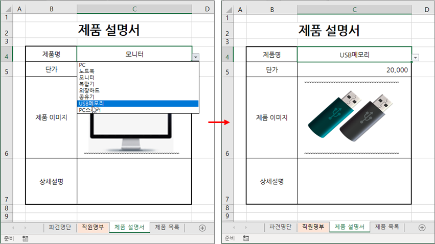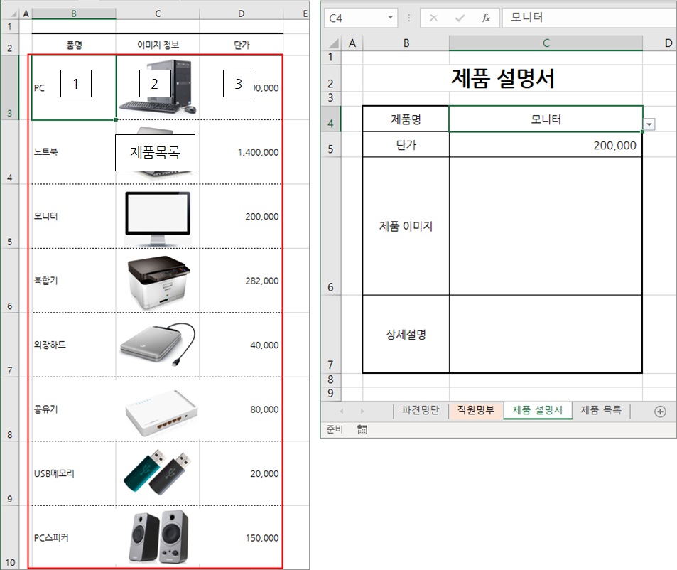 그런 다음 [제품 설명서] 시트에서 제품명을 목록에서 선택하면 단가와 제품 이미지를 제품 목록에서 찾아오도록 수식을 작성하는 방법을 소개하겠습니다.