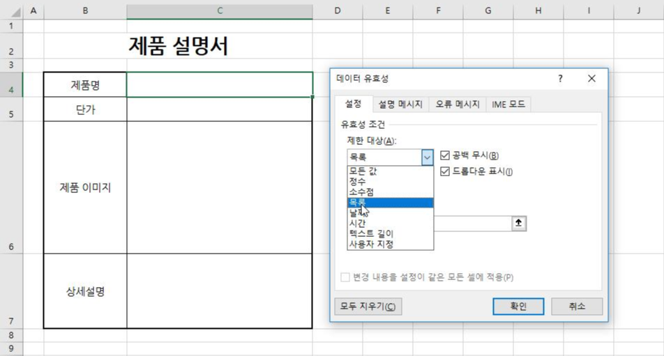 1. [C4] 셀을 선택하고 [데이터] 탭 → [데이터 도구] 그룹 → [데이터 유효성 검사]를 실행하고 [제한 대상] → [목록]을 선택합니다.