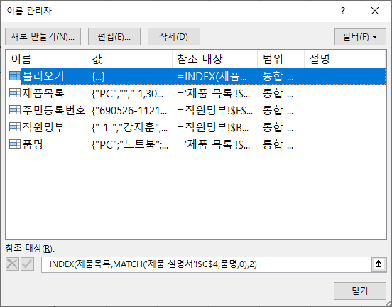 5. [이름 관리자] 대화상자에 ‘불러오기’ 이름이 추가된 것을 확인할 수 있습니다.