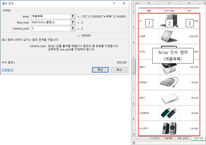 먼저 INDEX 함수의 첫 번째 Array 인수는 미리 이름으로 정의해둔 제품목록입니다.