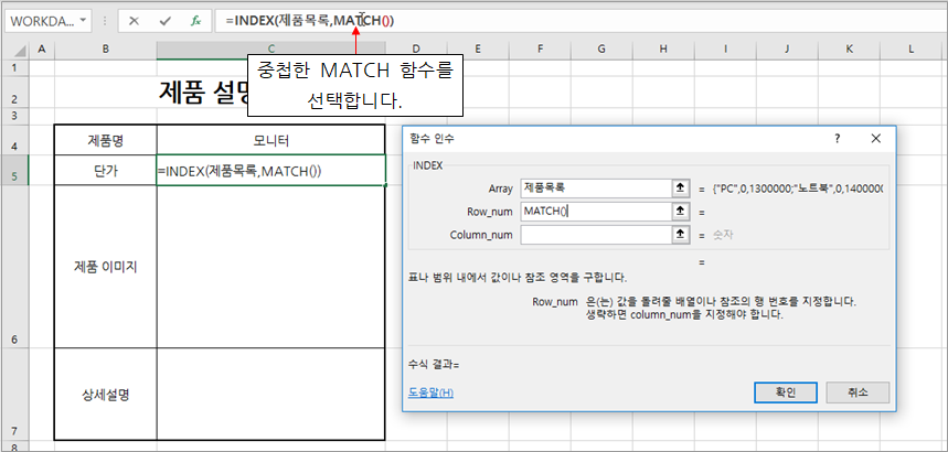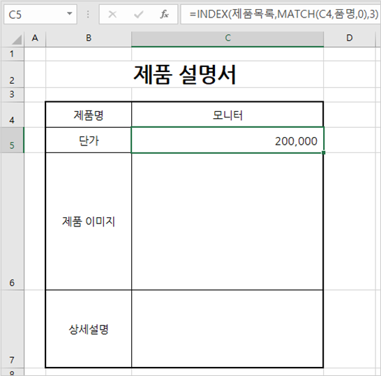 그래서 MATCH 함수를 INDEX 함수에 중첩하여 [제품 설명서]에서 선택된 제품명에 맞는 행 번호를 알아야 합니다.