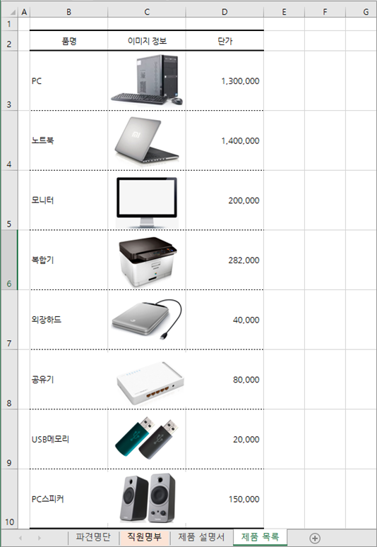 먼저 [제품 목록] 시트에 품목별 이미지 정보와 단가를 정리해 두었습니다.