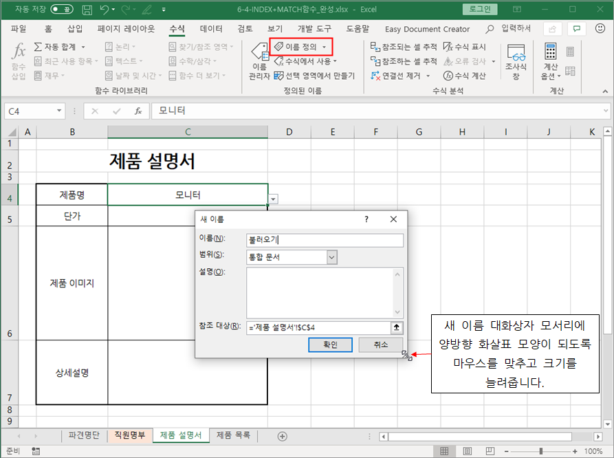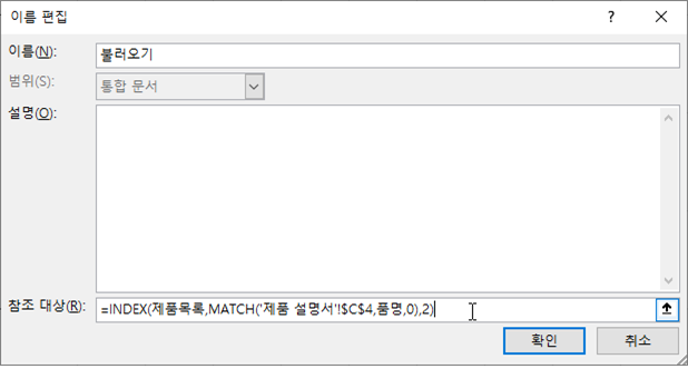 4. [참조 대상] 입력창에 =INDEX(제품목록,MATCH('제품 설명서'!$C$4,품명,0),2)라고 수식을 작성하고 [확인] 버튼을 클릭합니다 .