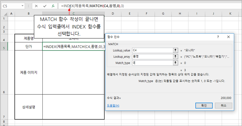 4. Lookup_array 인수는 제품목록 시트에 품명 범위를 이름으로 정의해둔 품명을 입력하고 Match_type 인수 입력창에 0을 입력한 다음 수식 입력줄에서 INDEX 함수를 선택합니다.
