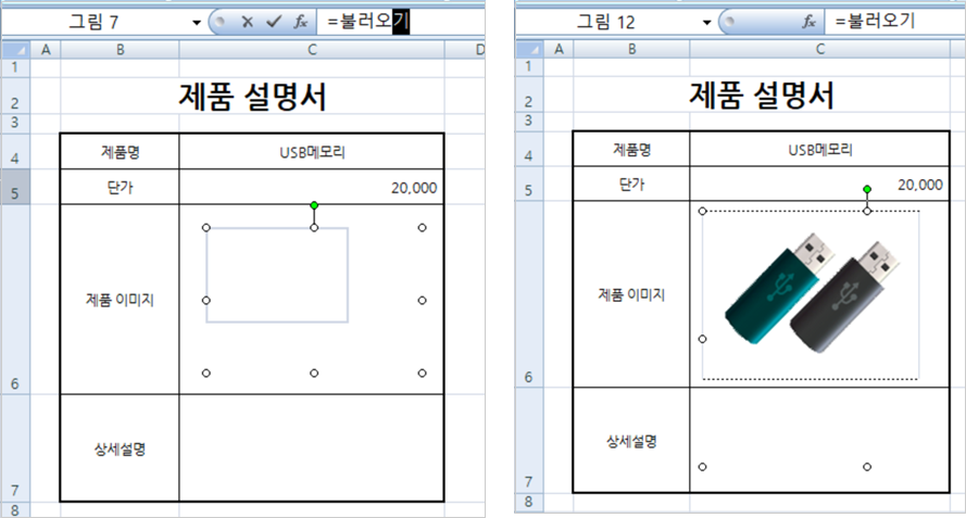 2. 붙여넣기 한 그림을 선택한 다음 수식 입력줄에 커서를 두고 =불러오기 라고 입력하고 <Enter> 누릅니다.
