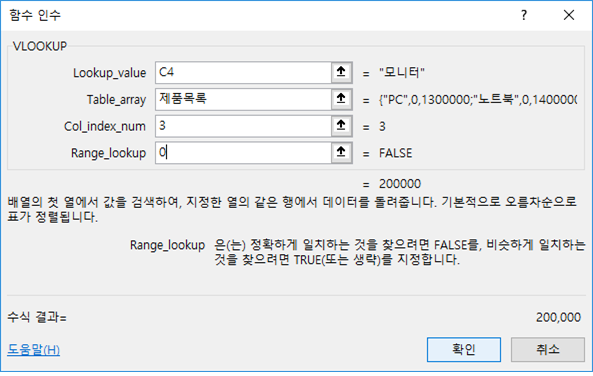 2. Lookup_value 인수는 [C4] 셀을 참조하고 Table_array 인수 입력창에 정의해 놓은 이름 제품목록을 입력합니다 .