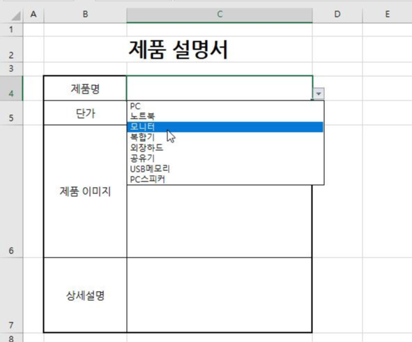 ‘모니터’를 선택하면 MATCH('제품 설명서'!$C$4,품명,0) 수식에 의해 3을 구합니다.