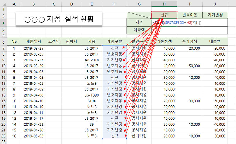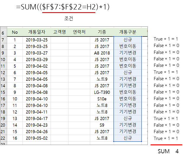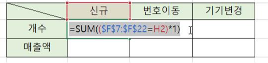 먼저 개통구분이 신규인 개수를 구하는 수식입니다.