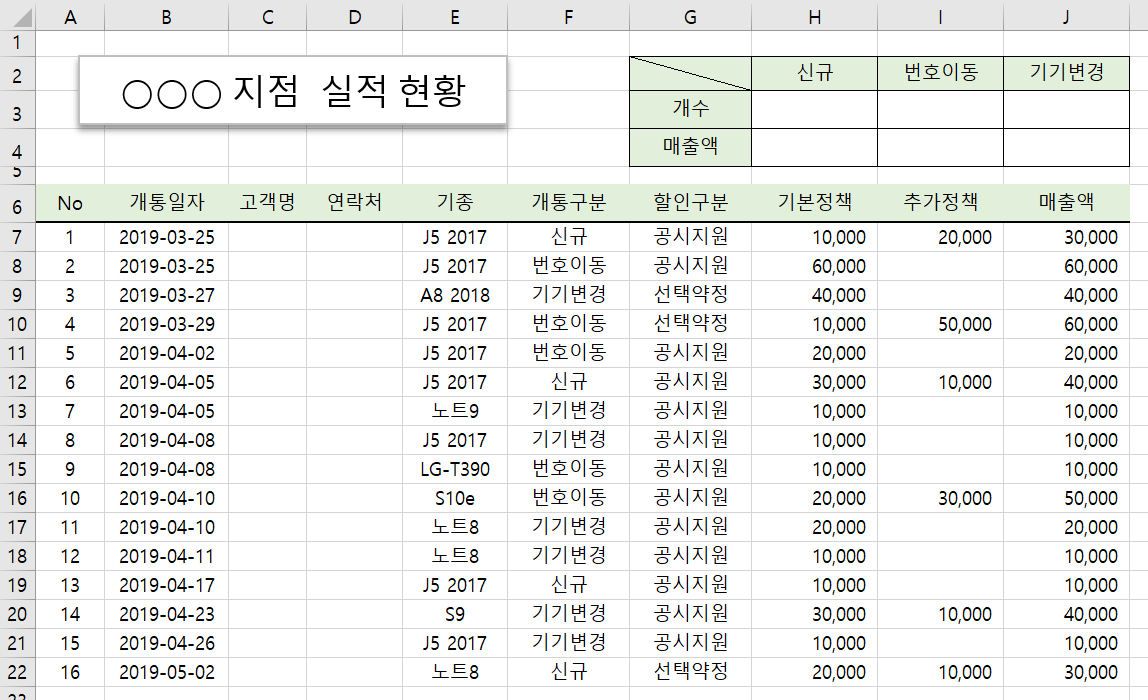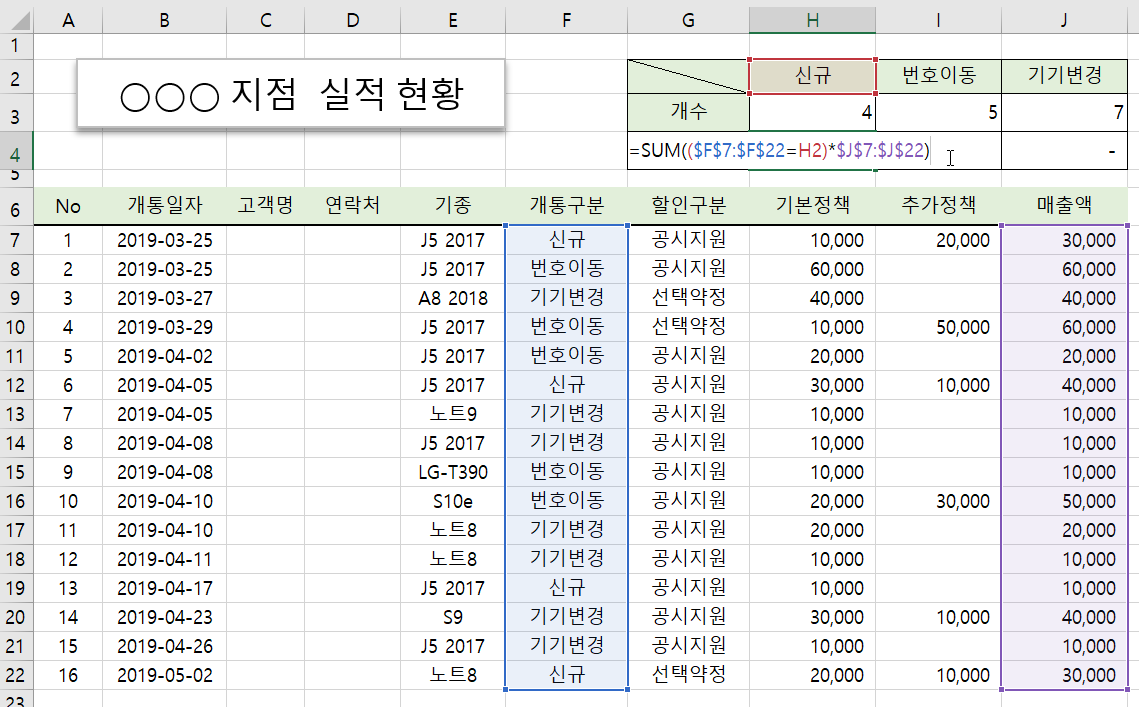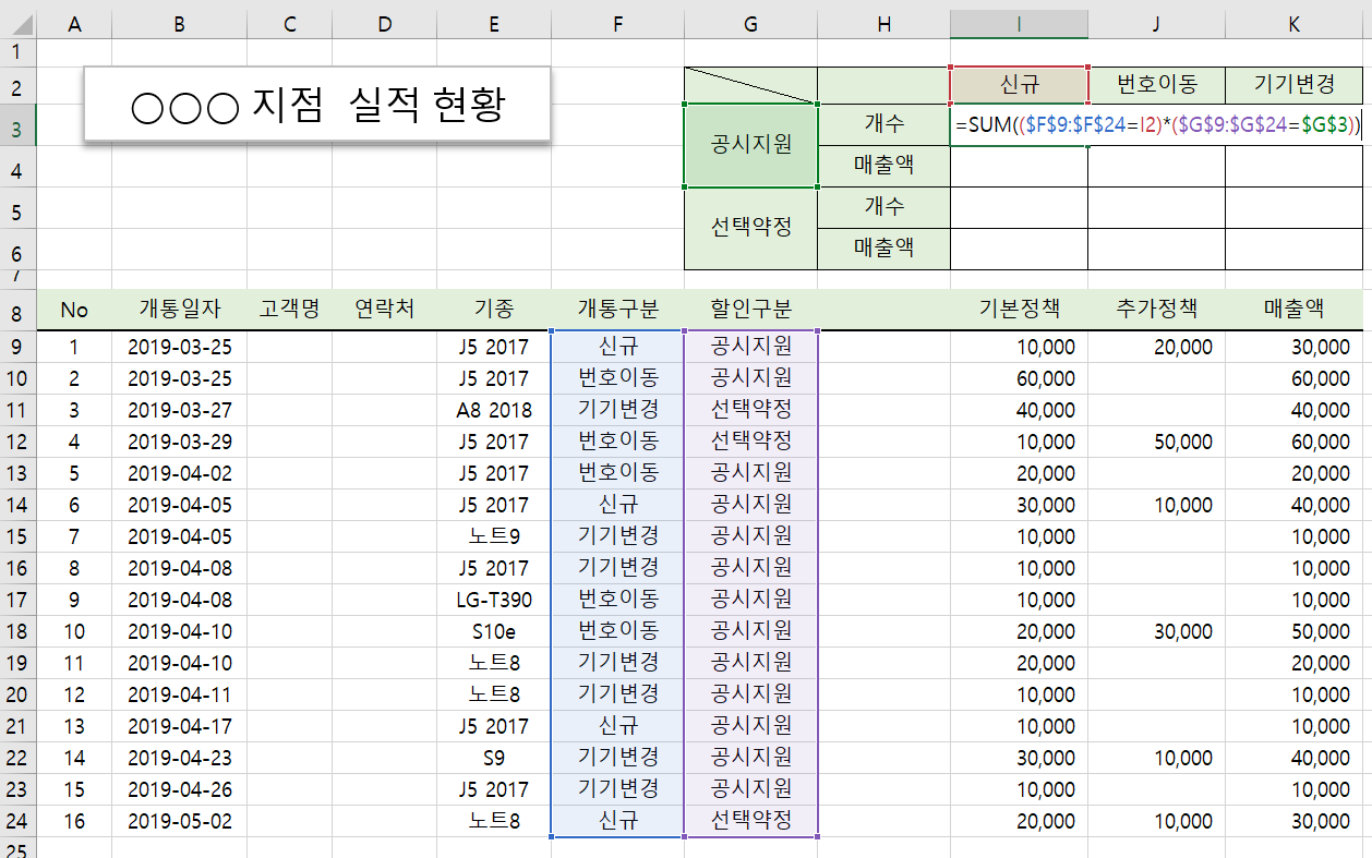○○○ 지점 실적 현황에서 개통구분 별로 신규, 번호이동, 기기변경 건의 개수와 매출액 합을 집계하려고 합니다.