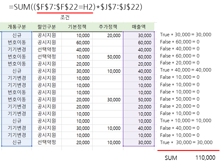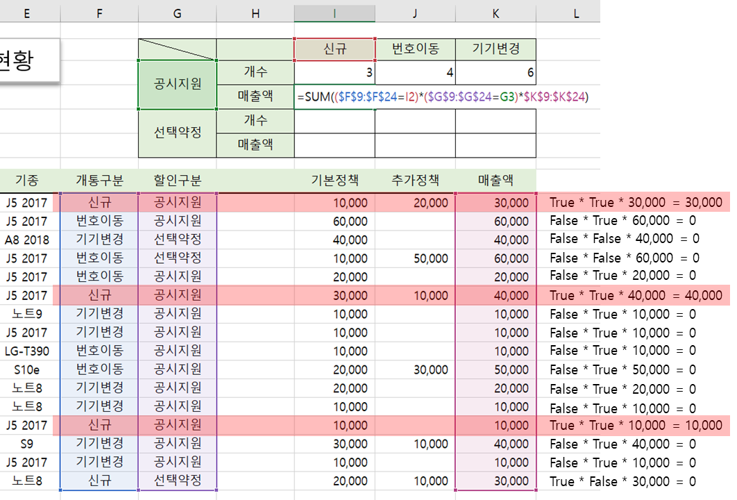 두 조건이 모두 일치하는 경우에 매출액과 곱하기 해서 매출액의 합계를 구합니다.