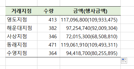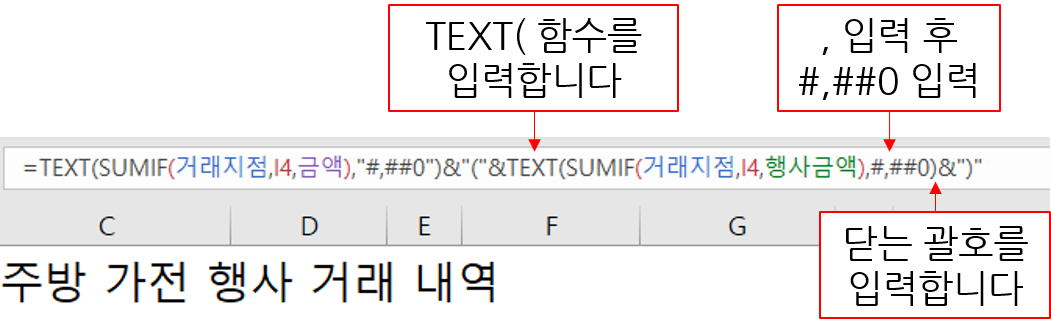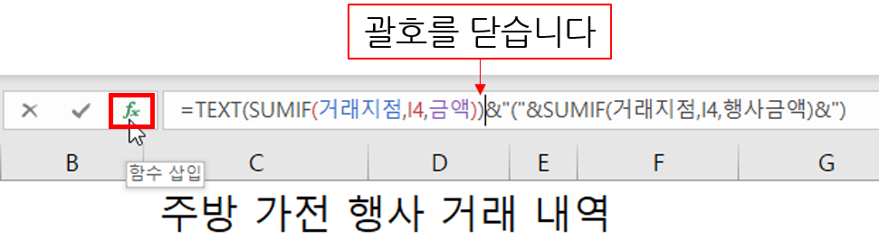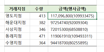 SUMIF 함수를 사용하여 거래지점별 금액의 합계를 구하고 &(연결 연산자)를 사용한 후 괄호 안에 거래지점별 행사금액의 합을 구했습니다.