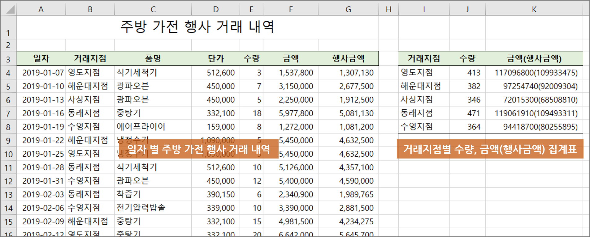 일자별 주방 가전 행사 거래 내역을 거래지점별로 수량, 금액(행사금액)을 집계한 표가 오른쪽에 있습니다.