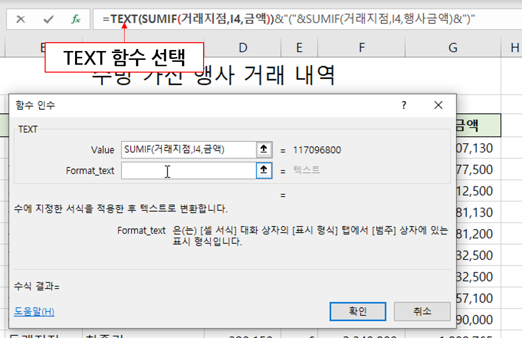 이때 함수 인수 대화상자가 SUMIF 함수를 편집하는 상태라면 수식 입력줄에서 TEXT 함수를 합니다.