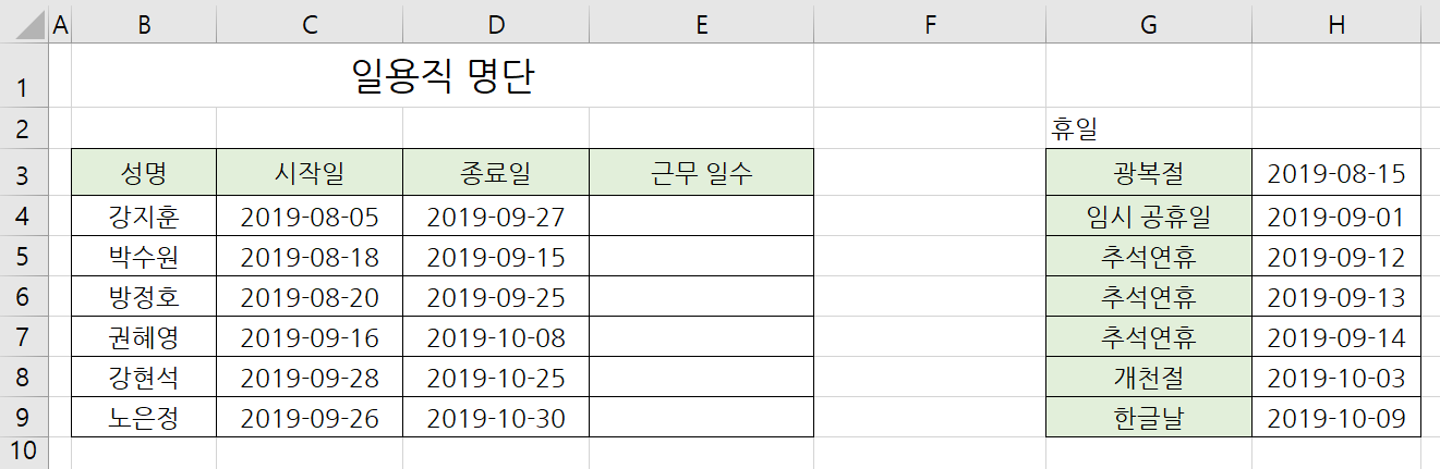 ※ 이때 휴일을 꼭 정리해서 시트에 작성해 두어야 합니다.