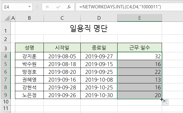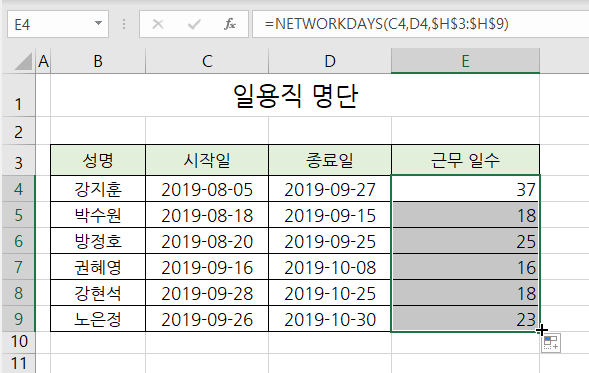 수식을 복사하여 나머지 명단의 근무 일수가 구합니다.