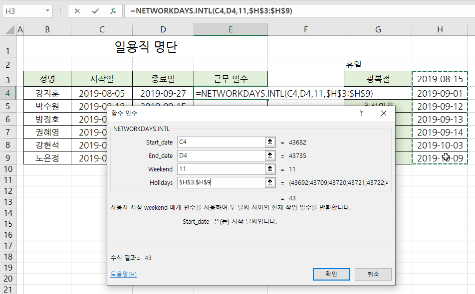 4. Holidays 인수에 [H3:H9] 셀 범위를 <F4>를 눌러 절대 참조합니다.