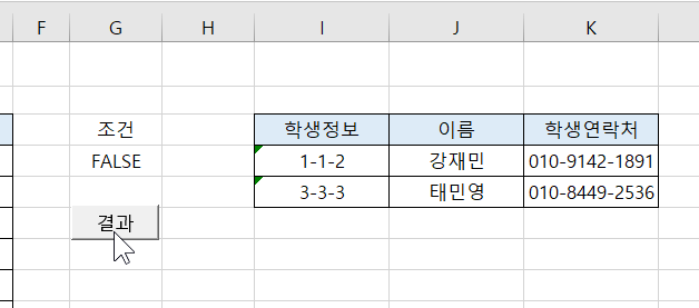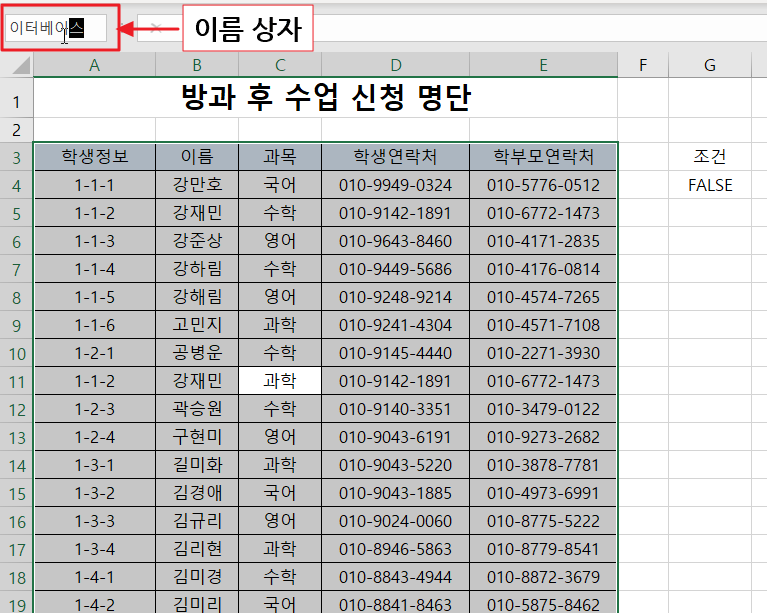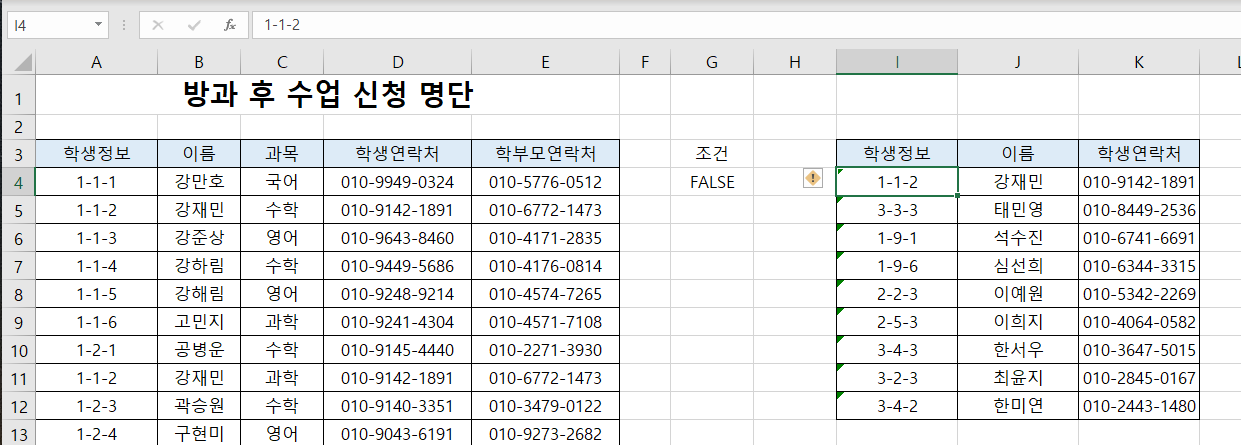물론 학생정보를 기준으로 정렬해서 뽑아볼 수도 있지만 지금 소개하는 고급 필터 사용법을 알면 별도의 셀에 학생 정보를 추출할 수 있습니다.