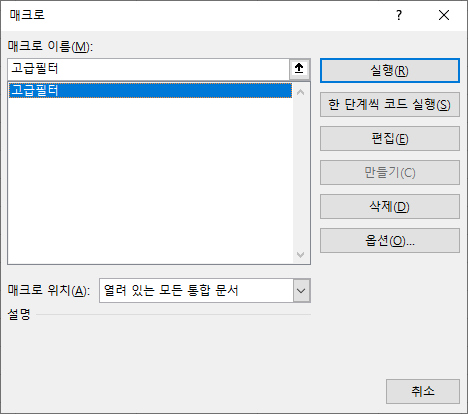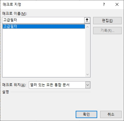 고급필터 매크로를 선택하고 [확인]을 누릅니다.
