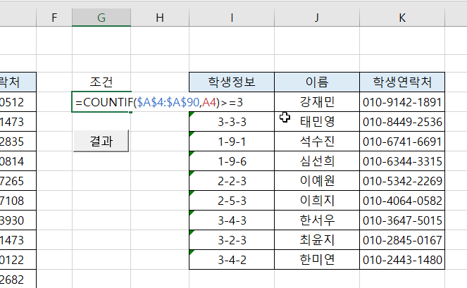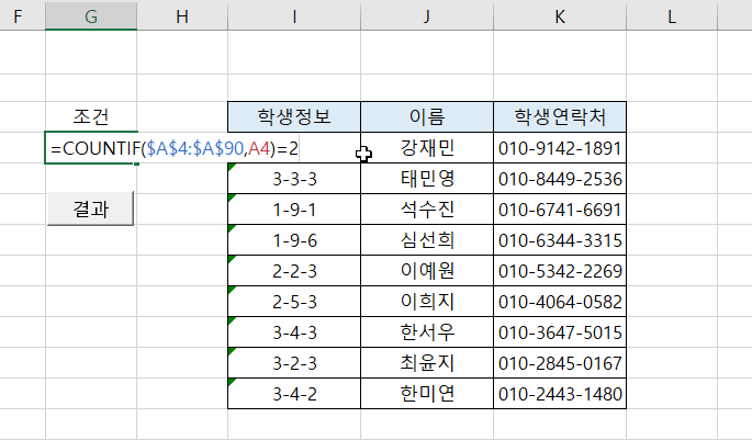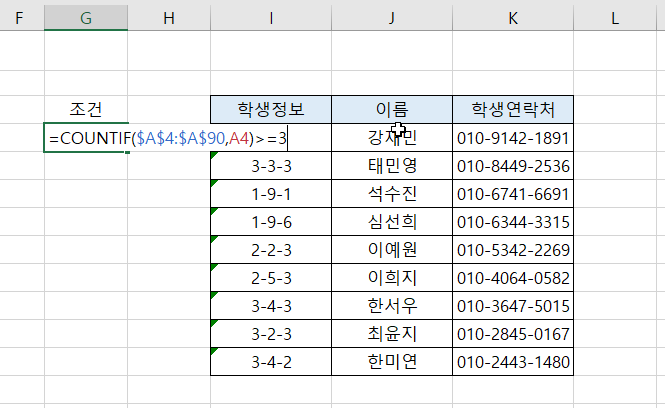수식은 학생정보 범위 A4:A90에서 A4 셀에 입력된 1-1-1 강만호가 입력된 개수를 구합니다.