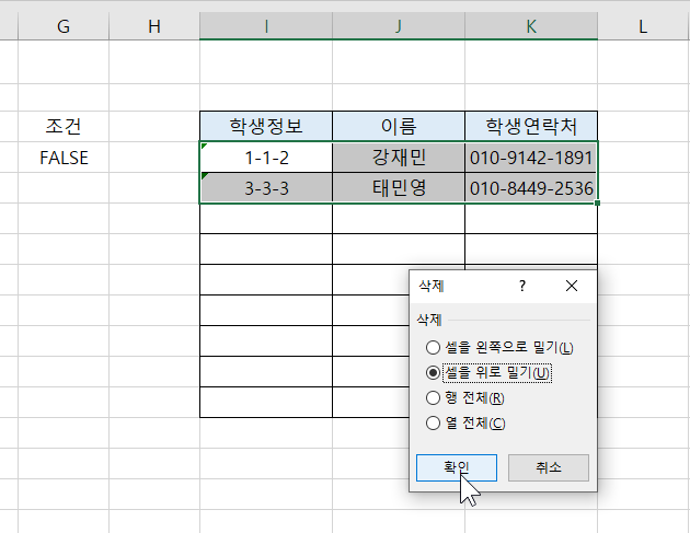 [I3:K3] 셀 범위에 '학생정보, 이름, 학생연락처'를 입력합니다. 열 너비를 조금 넓혀 둡니다.