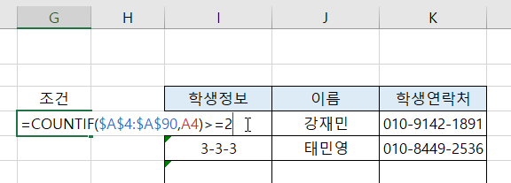 2. [G4] 셀에 =COUNTIF($A$4:$A$90,A4)>=2 이라고 조건식을 입력합니다.