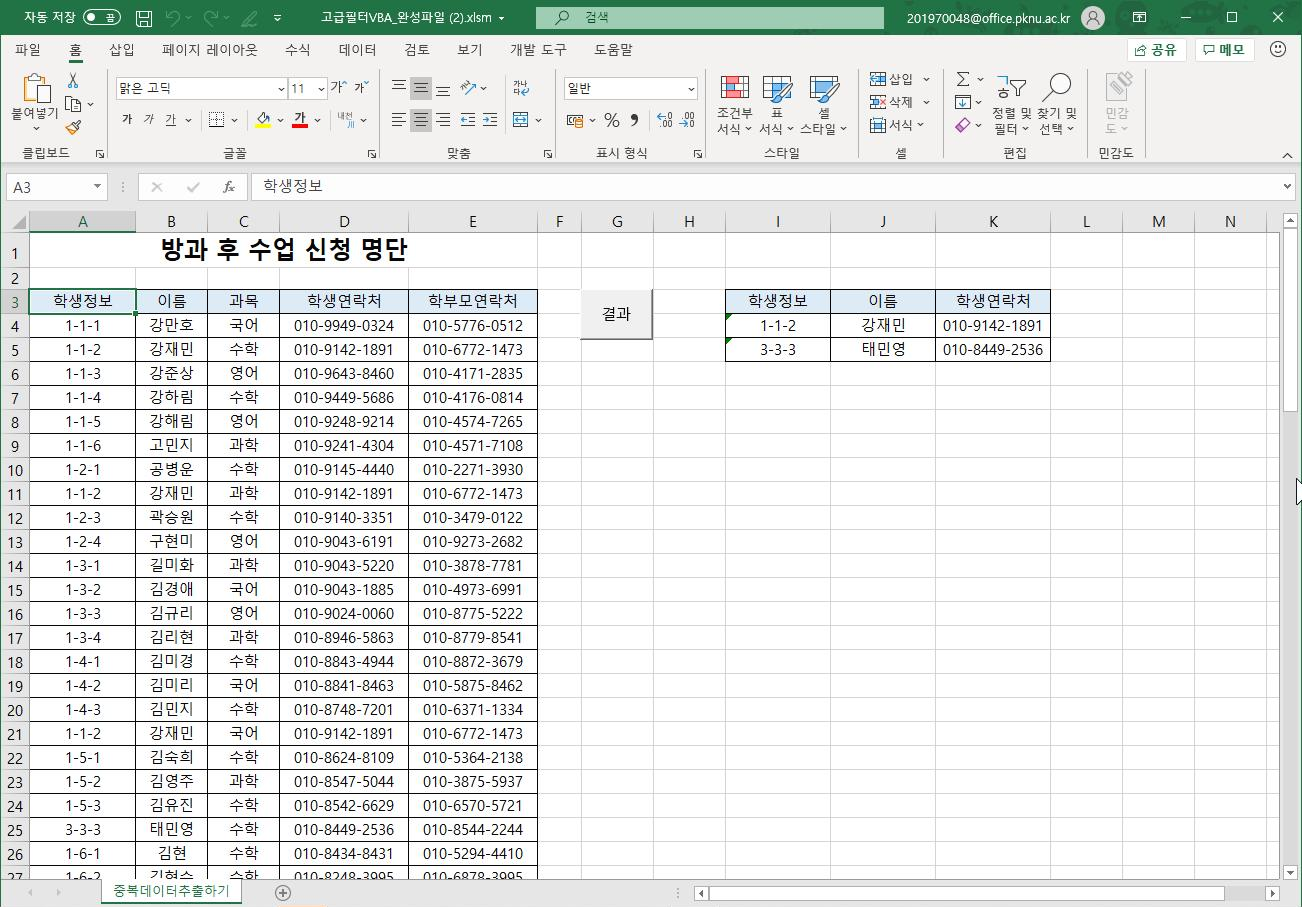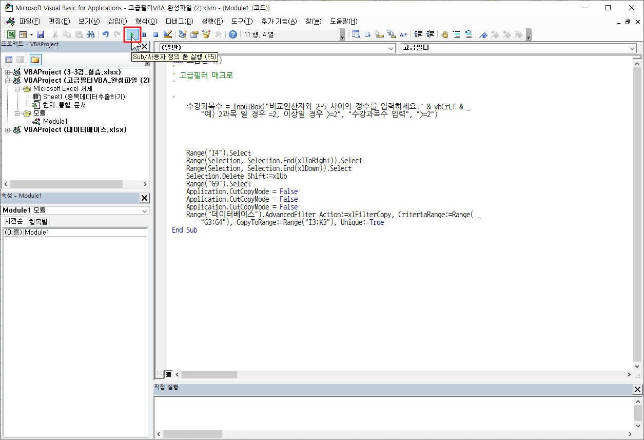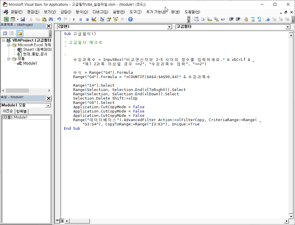 지난 [고급 필터 매크로] 강좌에서 수강 과목수를 변경하고 단추를 누르면, 기존 결과가 지워지고 고급 필터가 실행되는 매크로 작성법을 배웠습니다.
