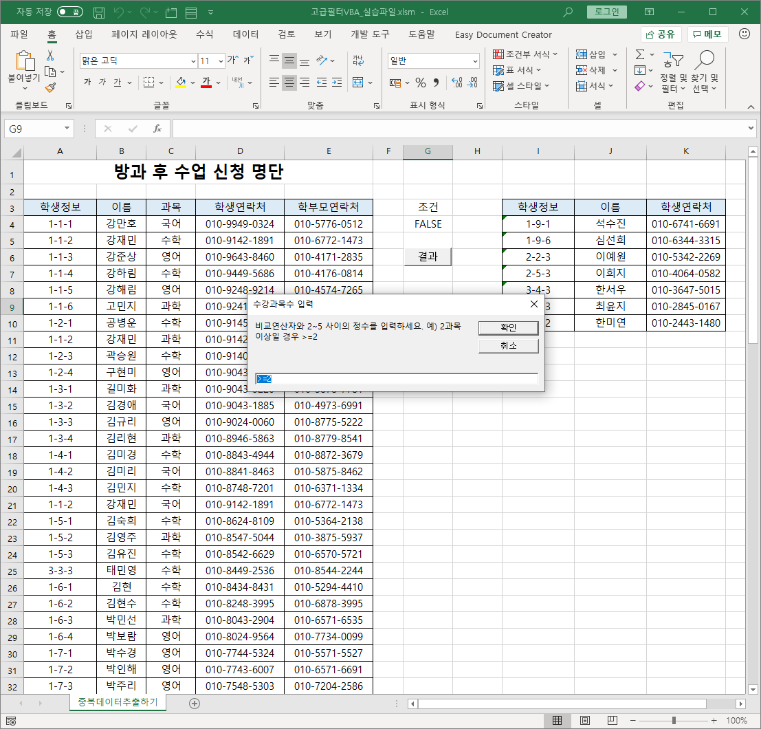 이번에는 고급 필터 조건식을 직접 수정하지 않고 InputBox에서 입력 받은 과목수에 맞게 내부적으로 수식이 수정되도록 해야 합니다.