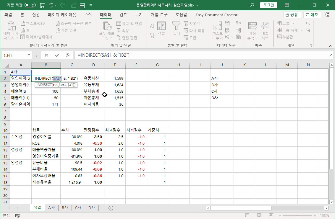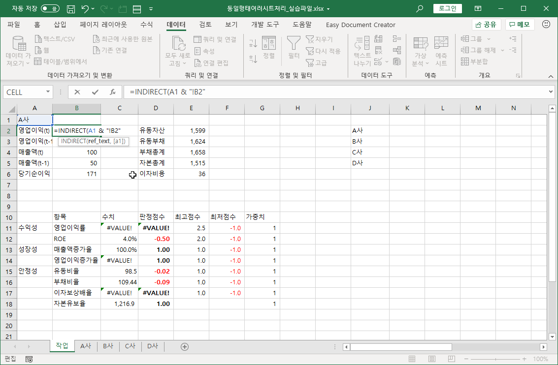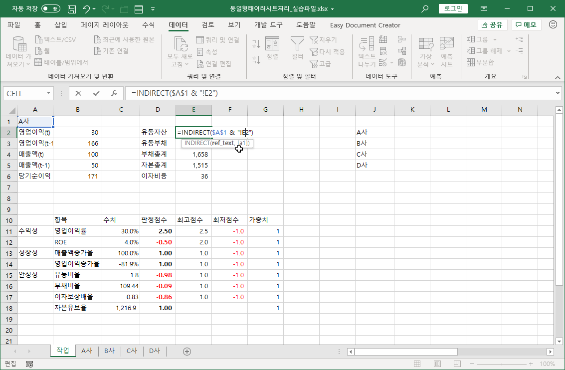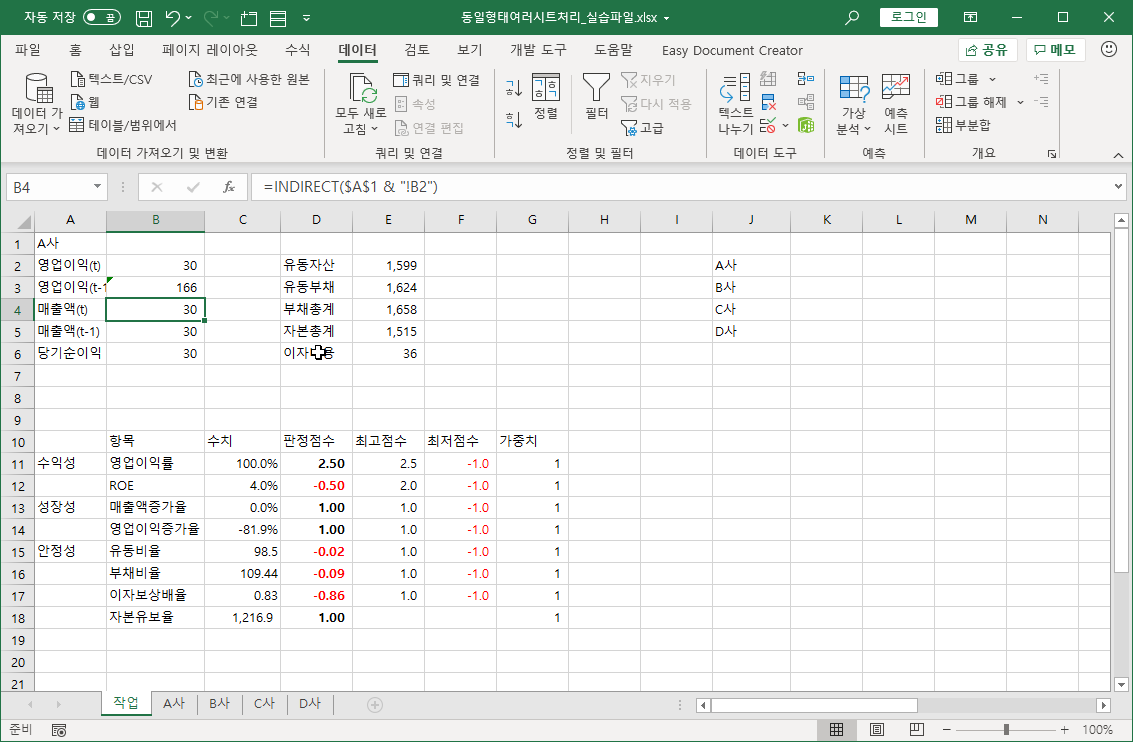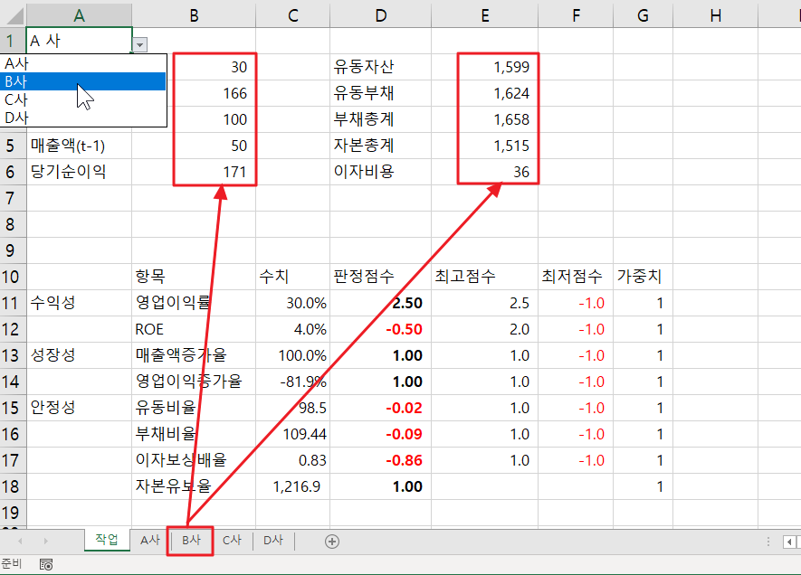 2. 회사명을 선택하면 해당하는 회사 시트에서 영업 이익, 매출액, 유동자산, 유동부채 등의 데이터가 자동으로 조회되어 표시되도록 하려고 합니다.