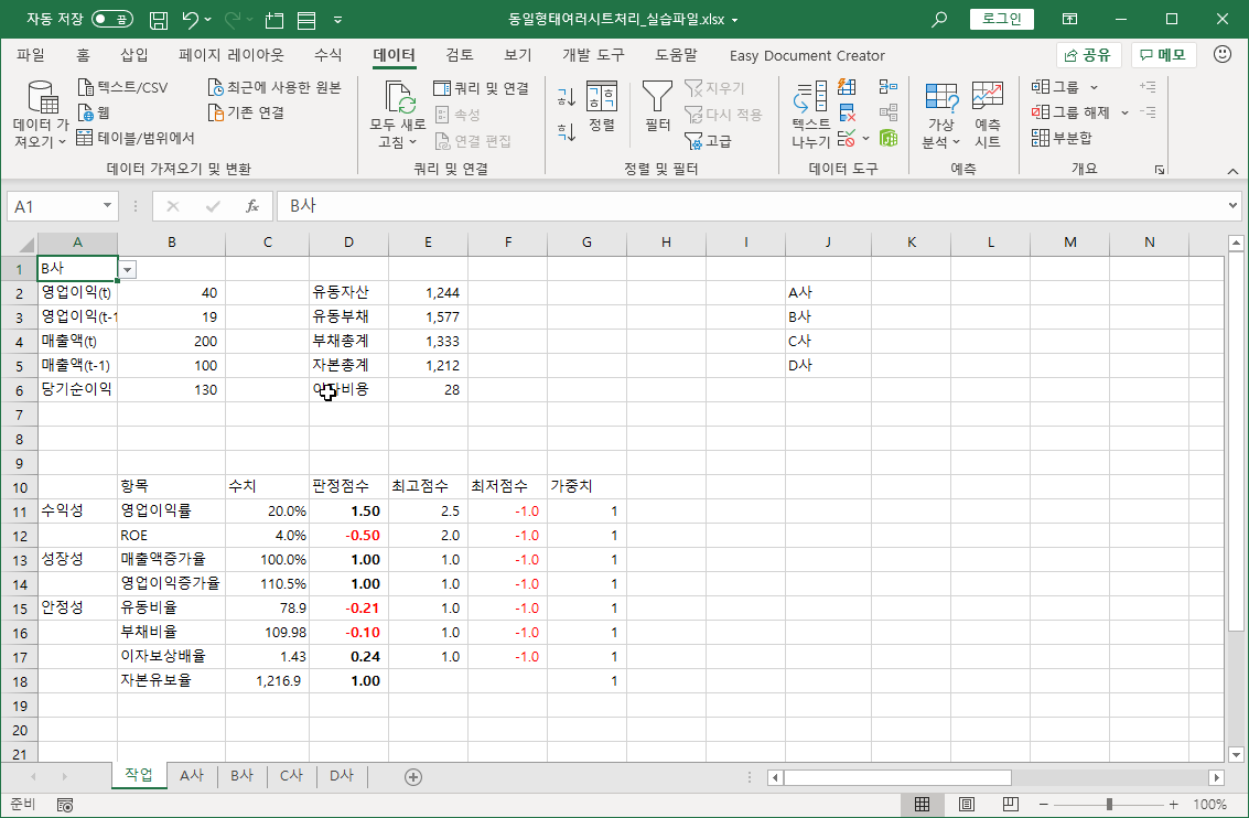 시트 형태는 모두 동일하고 회사별 데이터만 다르게 되어 있습니다.