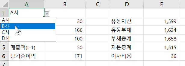 목록을 선택해 B사로 변경해보면 B사 시트 내용으로 모두 변경되는 것을 확인할 수 있습니다.