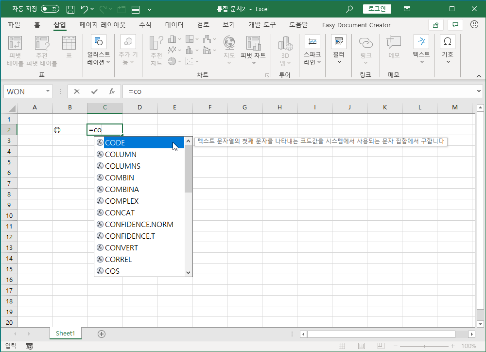 [B2] 셀에 삽입하려는 도형을 나타내고, [C2] 셀에 CODE 함수를 입력합니다.