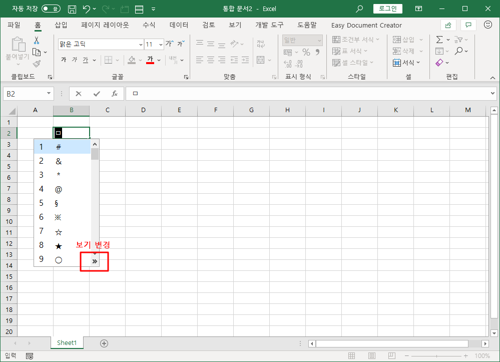나타난 목록표 아래 [보기 변경]을 눌러 모든 항목을 표시하고 삽입할 기호를 선택합니다.