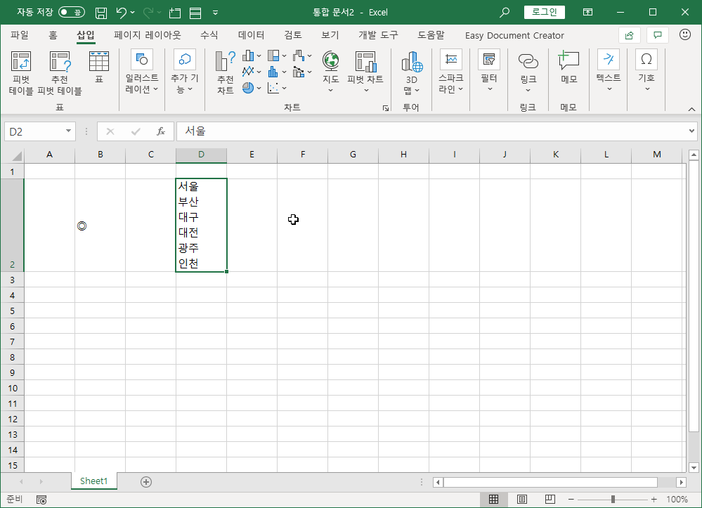 예를 들어 [D2] 셀에 서울부터 인천까지 여러 줄을 입력했습니다.