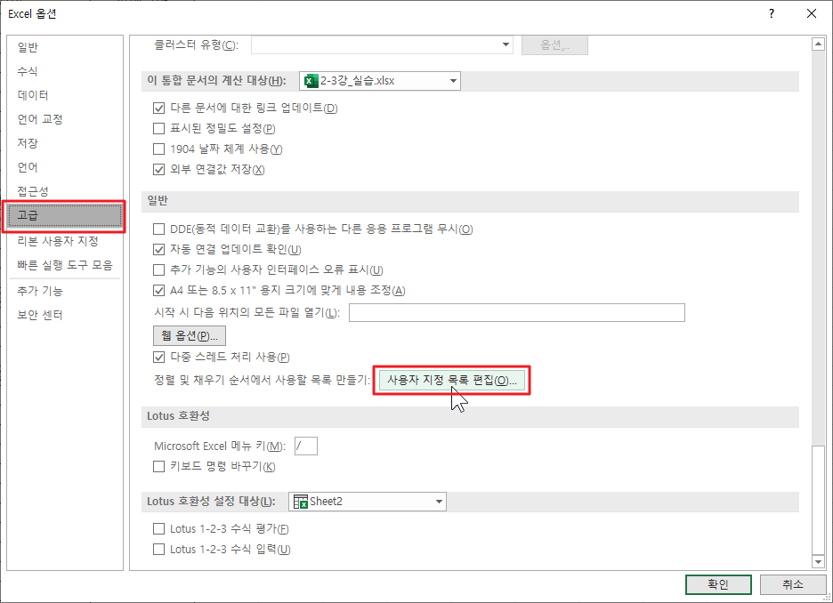 5. [파일] - [옵션] - [고급]을 선택하고 Excel 옵션 대화상자가 실행되면 [사용자 지정 목록 편집] 버튼을 누릅니다.