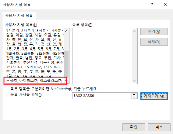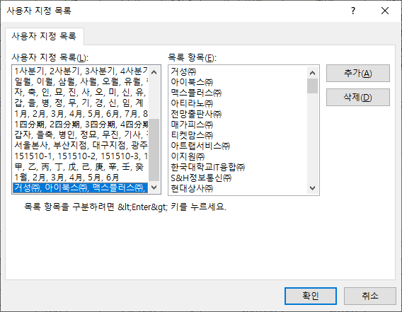 3. [사용자 지정 목록] 대화상자가 실행되면 추가해놓은 거래처명 목록을 선택하고 [확인]을 누릅니다.
