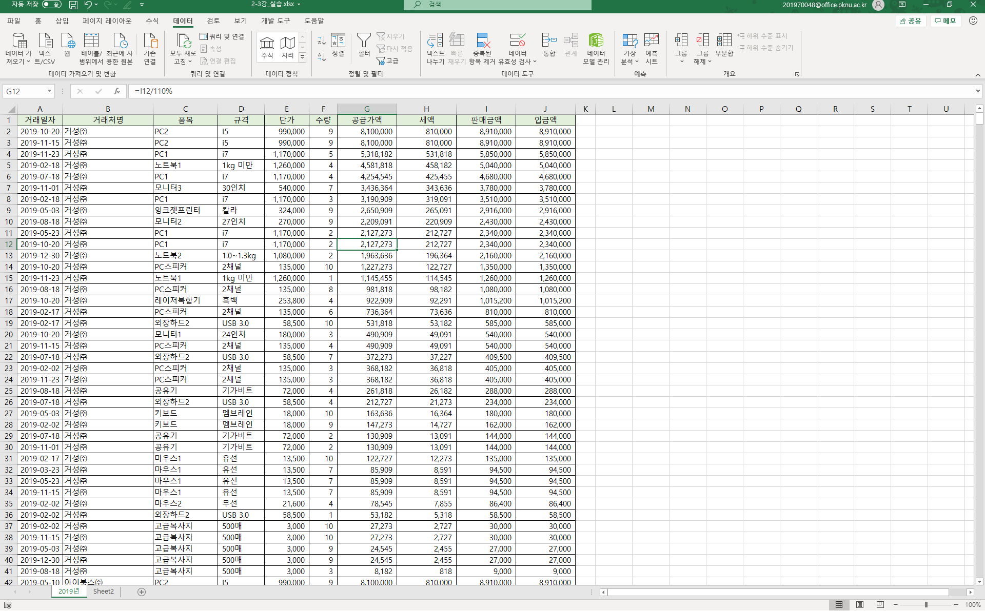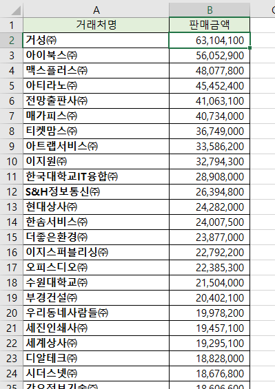 데이터를 스크롤해서 확인해보면 판매금액이 가장 많은 거래처 순으로 정렬되고 각 거래처 판매 금액도 많은 순서로 정렬되었습니다.