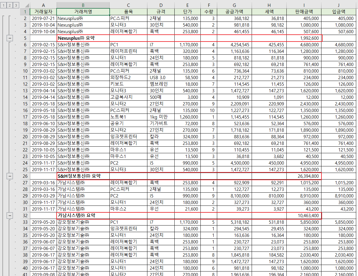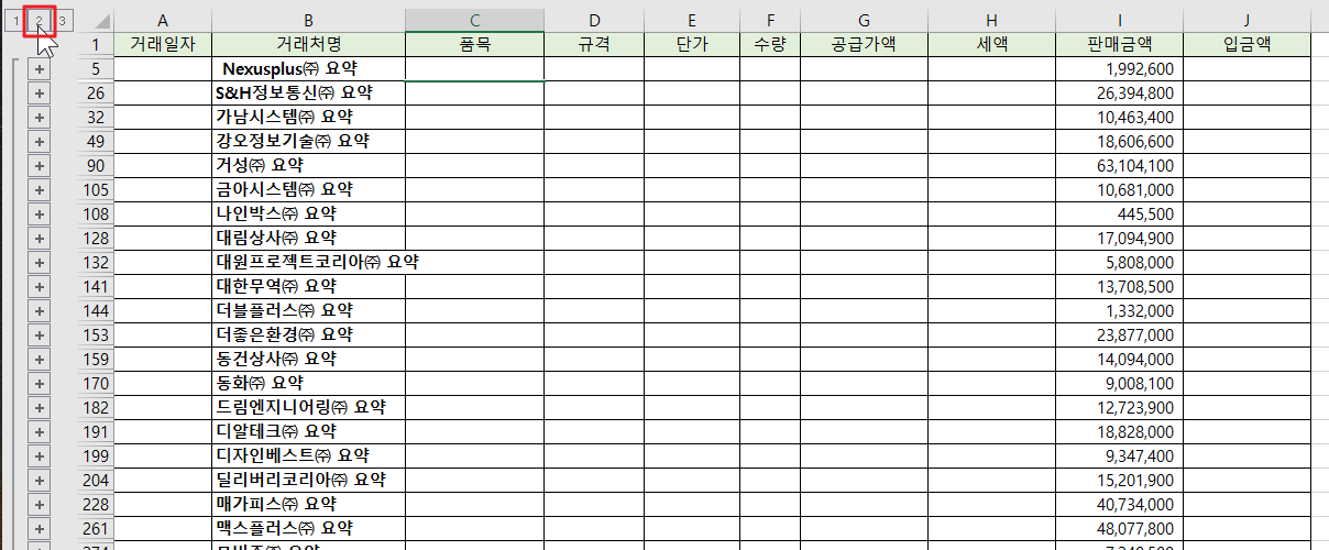 1. 거래처별로 정렬된 데이터를 부분합하고 윤곽 버튼 2번을 눌러 부분합 결과만 나타냅니다.