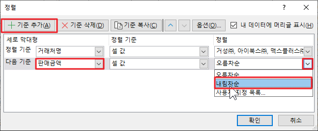 3. [기준 추가] 버튼을 눌러 '판매 금액'을 선택하고 정렬 방식을 '내림차순'을 선택하고 [확인]을 누릅니다.