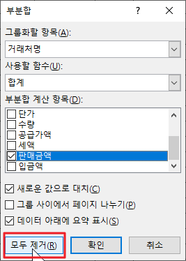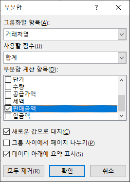 [그룹화할 항목]은 '거래처명', [사용할 함수]는 '합계', [부분합 계산 항목]은 '판매금액'을 선택하고 [확인]을 누릅니다.