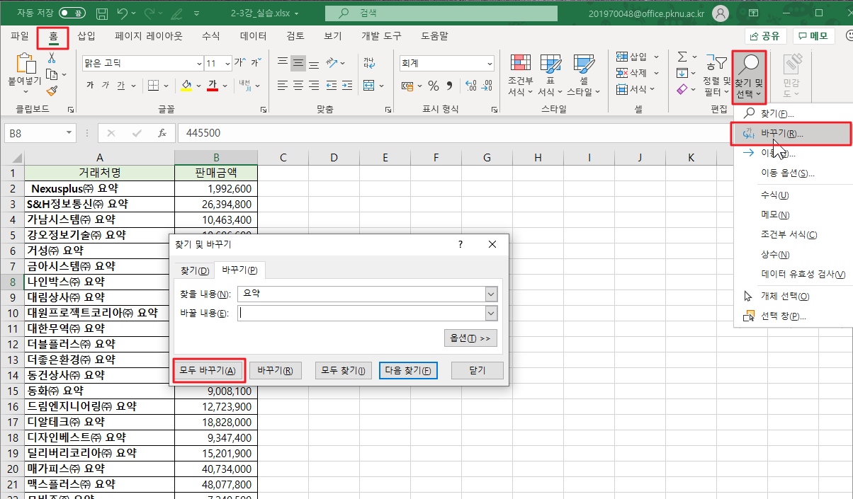 3. [홈] 탭 - [찾기 및 선택] - [바꾸기]를 선택합니다.