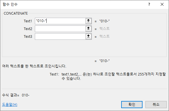 만들어진 전화번호를 합쳐 하나의 문자열로 만들기 위해 CONCATENATE 함수를 사용합니다.