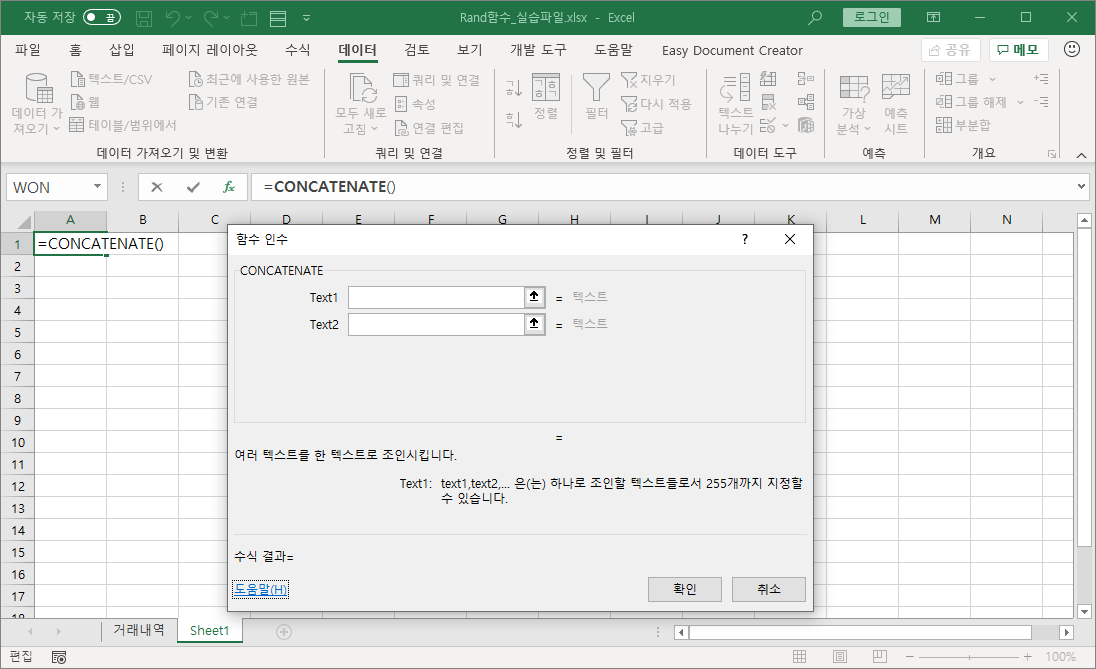 나중에 작성한 뒤 다시 CONCATENATE 함수 입력 창으로 전환하려면 수식 입력줄에서 CONCATENATE 함수 글자 부분을 클릭하면 됩니다.