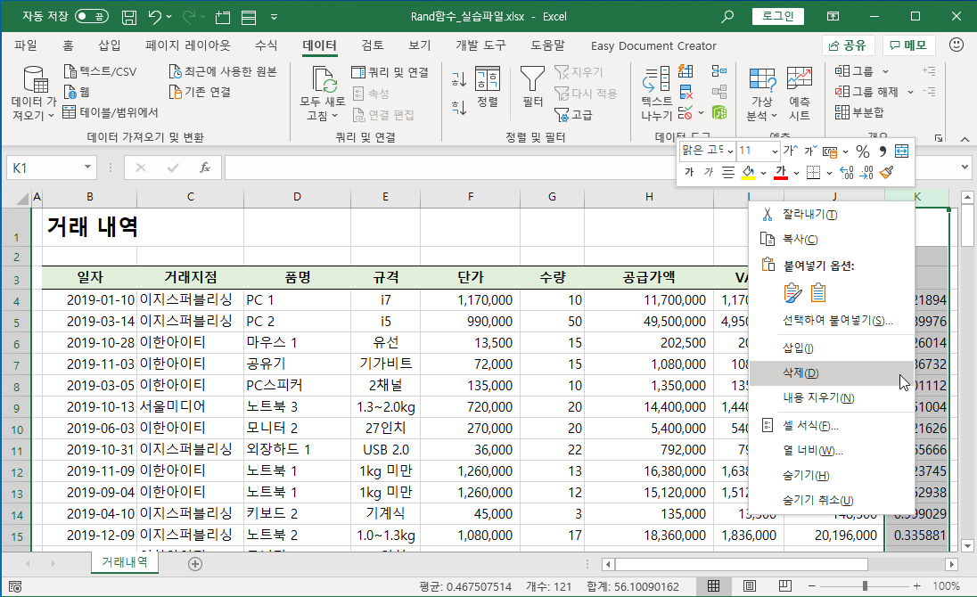 K 열문자를 클릭하고 마우스 오른쪽 클릭해 [삭제]를 선택합니다.